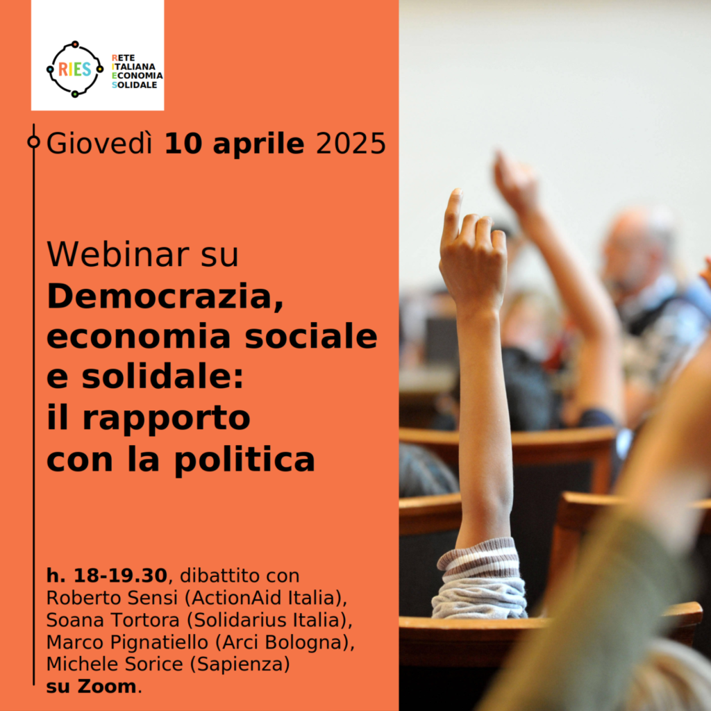 Il 10 aprile 2025, dalle 18 alle 19-45 in videoconferenza su Zoom, si terrà il primo appuntamento di una Incontri su democrazia e “diverse economie” dal titolo: Democrazia, economia sociale e solidale: il rapporto con la politica. Parteciperanno a questo primo incontro Roberto Sensi (ActionAid Italia), Soana Tortora (Solidarius Italia), Marco Pignatiello (Arci Bologna), Michele Sorice (Sapienza Università di Roma). Per iscriversi: https://uniroma1.zoom.us/meeting/register/XTjciCuBSF6SNZ4MGDHoUw Dopo l’iscrizione, riceverai un’email di conferma con le informazioni necessarie per entrare nella riunione. L’inizitiva è organizzata dalla RIES – Rete Italiana per l’Economia Solidale, che ha deciso di svolgere un ruolo più attivo nel dibattito pubblico. Un proposito impegnativo che richiede la ricerca di una visione condivisa all’interno del mondo italiano dell’economia solidale per tradurre le istanze solidali in una prospettiva politica e di entrare in relazione con altre realtà già attive sul territorio. Per costruire questa visione stiamo organizzando una serie di incontri di confronto e approfondimento anche con realtà dell’economia sociale, del terzo settore e altri movimenti. L’obiettivo è di individuare temi da proporre insieme a processi e modalità operative da utilizzare nel confronto con istituzioni e società italiana, alle diverse scale, dal nazionale al locale. Per maggiori informazioni: Incontri RIES